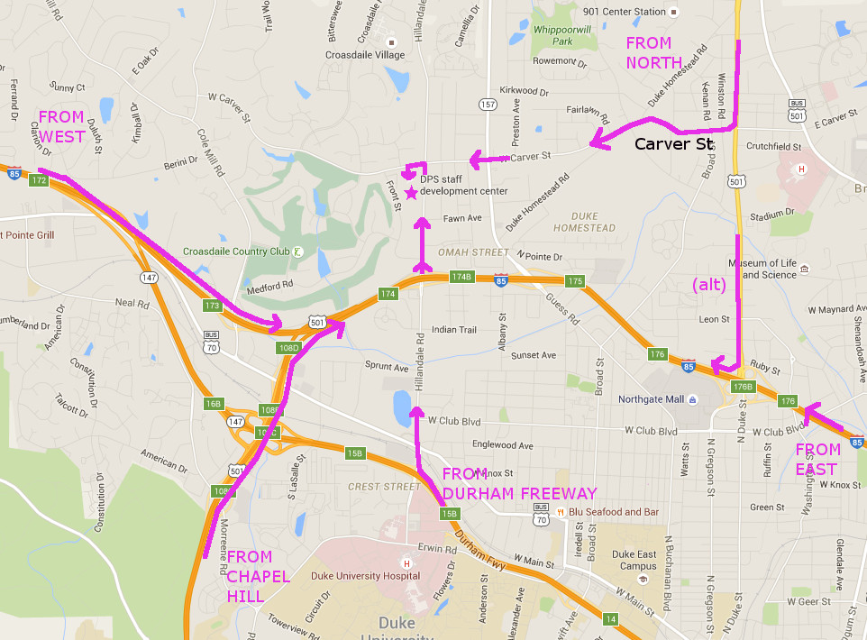 Durham Freeway/NC 147 - Use Exit 158 (Fulton St/Hillandale Rd - Duke Hospital). Turn North (away from Duke Hospital) onto Hillandale Rd and keep going for a while.
