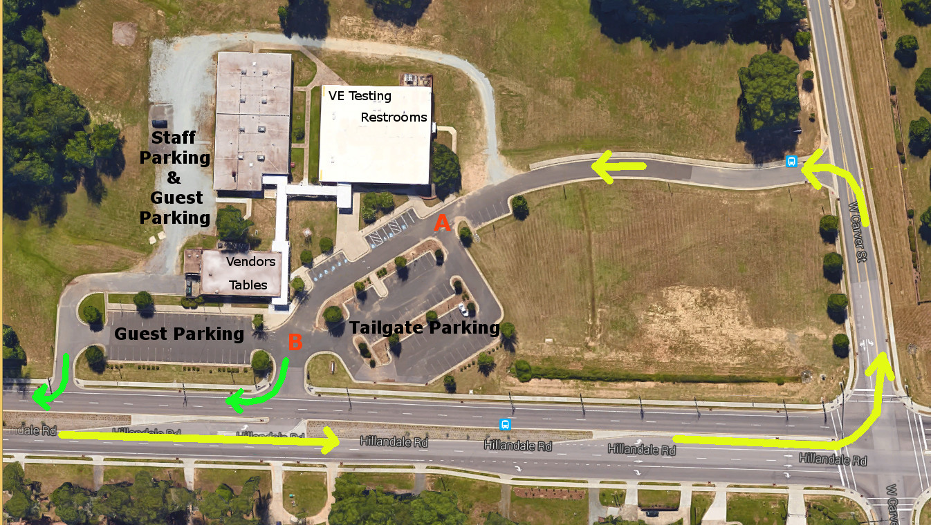 Driving north on Hillandale Rd, continue approximately 1/4 mile to next stoplight at intersection with W. Carver Street and turn left. From W. Carver make the first left into the DurHamFest driveway to parking lot.